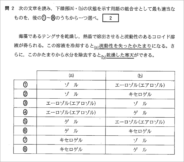 『ゾルは液体、ゲルは固体、キセロゲルはゲルを乾燥させたもの』という基本事項を押さえていれば、「(a)流動性を失ったかたまり」は固体(ゲル)であり、「(b)乾燥した寒天」はキセロゲルと判断でき、⑥が正しいと分かります。
