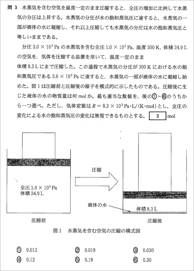 続いて問3です。苦手な人が多い気体の計算問題も例外なく、基本事項を押さえていれば簡単に解けます。