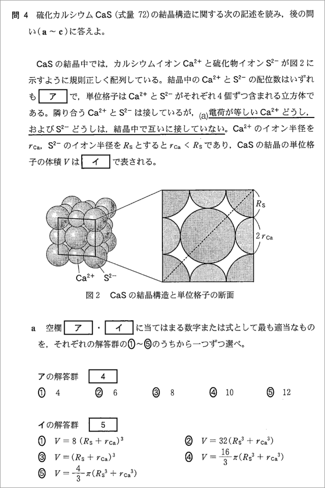 単位格子の体積については、単位格子の断面図から陽イオンと陰イオンが接しているところに着目すると、単位格子の1辺の長さは 2(R S + r Ca) と分かります(結晶格子の基本事項)。よって体積は、3乗して 8(R S + r Ca) 3 となり、①が答えと分かります。