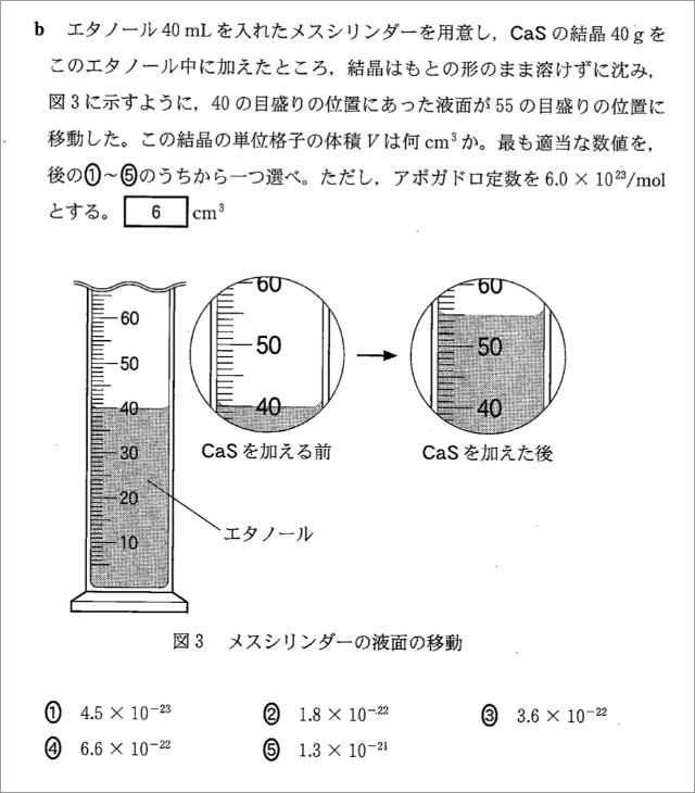 よって単位格子の体積は、結晶の体積 15 cm 3 ÷ 結晶中の単位格子の数 5/6 ×10 23 個 = 1.8×10 -22 cm 3 で、②が答えと分かります。これも簡単な算数の問題と思えば良いです。