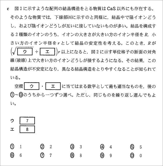 問題文中に『図2に示す単位格子の断面の対角線(破線)上で大きいイオンどおしが接するようになる』とヒントが書かれています。中学数学(三平方の定理)を少し使えば、問4aで求めた単位格子の1辺の長さ 2(R