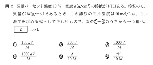 3] であり、体積・重さ・密度の関係から、溶液の重さは 1000V・d [g] であることが分かります。また、質量パーセント濃度 10% より、溶質の重さは 100V・d であることが分かります。さらに、溶質のモル質量 M より、溶質のモル数は 100dV/M [mol] であることが分かります。したがってモル濃度は、V で割って 100d/M [mol/L] であることが分かります。