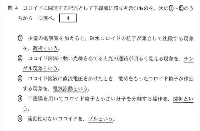 続いて問4です。こちらもコロイドの基本事項を押さえていれば難なく解けます。