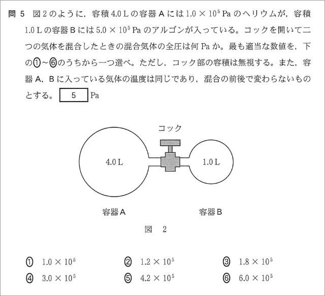 続いて問5です。苦手な人が多い気体の計算問題も例外なく、基本事項を押さえていれば簡単に解けます。