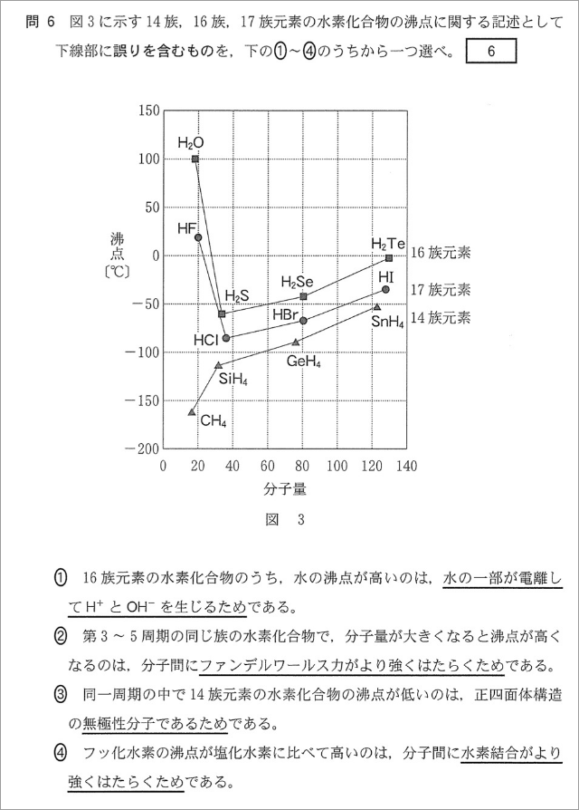 ①の正誤は、水の沸点が高いのは水素結合がはたらくためであり、誤りであると分かります。