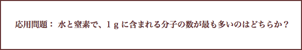 つまり「分子量の小さい方が、分子の数が多くなる」と気づくことができます。よって、水の分子量: 18、窒素の分子量: 28 より、答えは水となります。